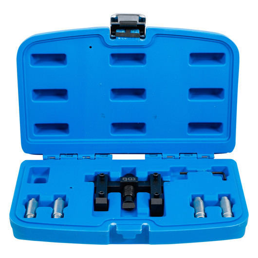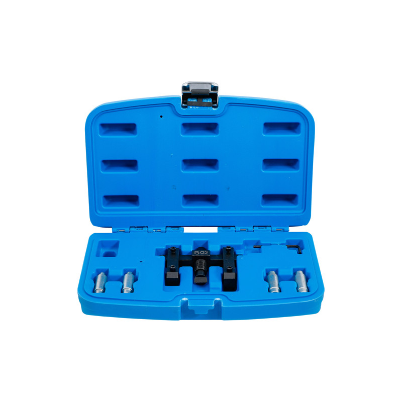 - mit 2 wechselbaren Spreiz-Einsätzen (5 mm und 8 mm Tiefe) und Führungsbolzen 8x10 mm (2x) und 10x12 mm (2x) für die Stoßdämpferaufnahme am Radlagergehäuse beim Dämpferwechsel, Kugelgelenkaufnahme am Quer-/Dreieckslenker bei Demontage des Federbeines u.a.