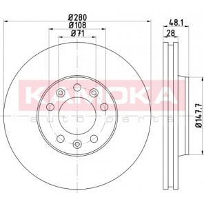 Einbauseite: Vorderachse | Bremsscheibenart: belüftet | Bremsscheibendicke [mm]: 28 | Lochkreis-Ø [mm]: 108 | Lochanzahl: 5 | Höhe [mm]: 48 | Zentrierungsdurchmesser [mm]: 71 | Oberfläche: beschichtet | Außendurchmesser [mm]: 280