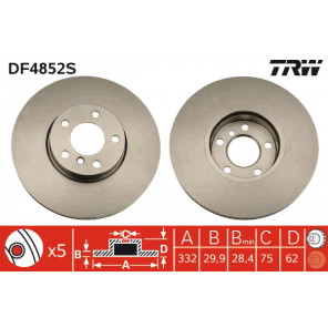 Bremsscheibenart: belüftet | Außendurchmesser [mm]: 332 | Bremsscheibendicke [mm]: 29,9 | Mindestdicke [mm]: 28,4 | Höhe [mm]: 62 | Lochanzahl: 5 | Zentrierungsdurchmesser [mm]: 75 | Lochkreis-Ø [mm]: 120 | Gewindemaß: 16,5 | Bearbeitung: hochgekohlt | Farbe: schwarz | Oberfläche: lackiert