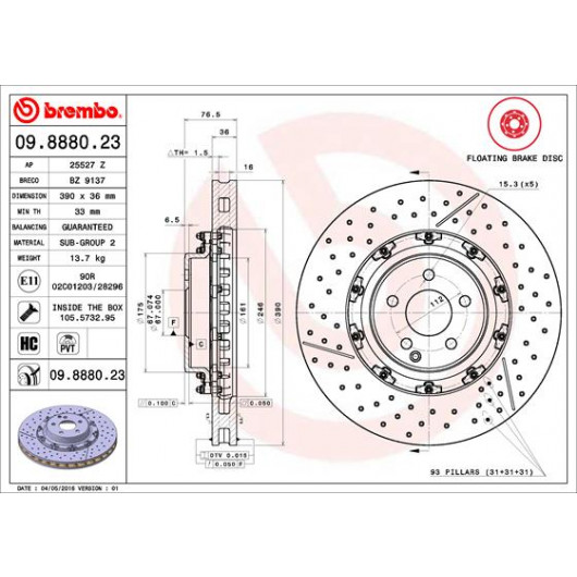 Lochanzahl: 5 | Zentrierungsdurchmesser [mm]: 67 | Oberfläche: beschichtet | Ergänzungsartikel/Ergänzende Info 2: mit Schrauben | Bearbeitung: hochgekohlt | Mindestdicke [mm]: 33 | Bremsscheibendicke [mm]: 36 | Bremsscheibenart: Geschlitzt/Gelocht, Innenbelüftet | Höhe [mm]: 76.5 | Durchmesser [mm]: 390