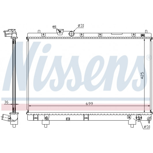 Kühlrippenmaterial: Aluminium | Netztiefe [mm]: 16 | Netzlänge [mm]: 425 | Netzbreite [mm]: 698 | Einlass-Ø [mm]: 31 | Auslass-Ø [mm]: 31 | Kühlerausführung: Kühlrippen gelötet | Ergänzungsartikel/Ergänzende Info 2: ohne Ausgleichsbehälter | Ergänzungsartikel/Ergänzende Info: ohne Dichtung | Material Wasserkasten (Kühler): Kunststoff