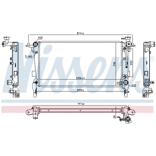 Kühlrippenmaterial: Aluminium | Netztiefe [mm]: 26 | Netzlänge [mm]: 639 | Netzbreite [mm]: 359 | Einlass-Ø [mm]: 35 | Auslass-Ø [mm]: 35 | Kühlerausführung: Kühlrippen gelötet | Ergänzungsartikel/Ergänzende Info 2: ohne Verschlussdeckel, ohne Ausgleichsbehälter | Ergänzungsartikel/Ergänzende Info: mit Ölkühler, ohne Dichtung | Material Wasserkasten (Kühler): Kunststoff