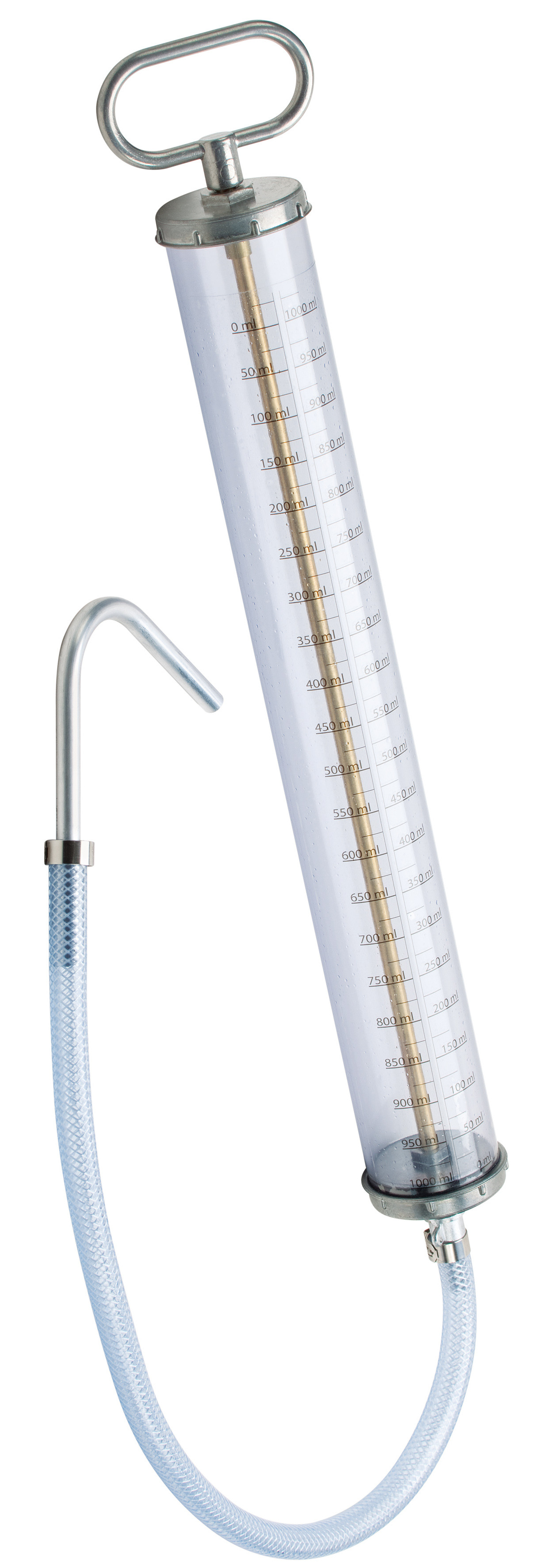 Handdosierspritze mit transparentem Mantelrohr aus Hart-PVC und einer Skalierung zur genauen Dosierung. Die Befüllung an schwer zugänglichen Getrieben wird durch einen PVC-Flexschlauch und einen gebogenen Auslauf erleichtert.